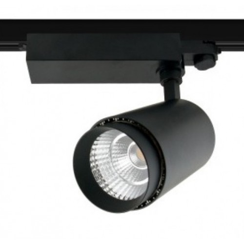 Трековый LED-светильник со светодиодом мощностью 30 Вт. Литой алюминиевый корпус белого цвета c охлаждающим радиатором. Отражатель из полимера с металлическим напылением с углом рассеивания 20 градуса. Рассеиватель из прозрачного стекла. В комплект входит драйвер, светодиод, коннектор для шинопровода.